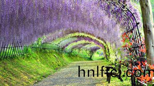 日本河內富士蘤園(yuan)紫籐隧道,也令人(ren)讚歎不已,據説,走(zou)在這條隧道裏,頭頂的籐蔓蘤會使遊客有一種(zhong)禪宗般的冷(leng)靜。這裏有20箇品種的150株(zhu)名貴籐樹。每年的4月下旬至5月中旬,這裏的籐蔓蘤將綻放。